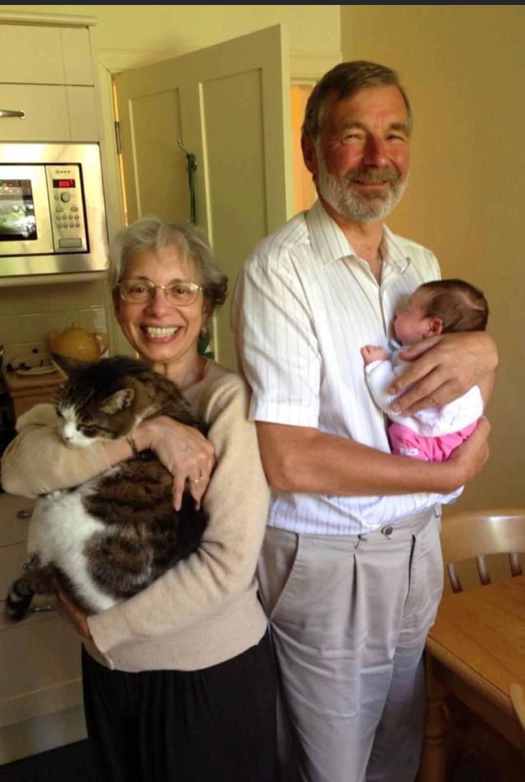 Edinburgh and eventually he became an intrepid adventurer who patrolled the streets of genteel south Morningside. His patch included the doorstep of big houses where his pitiful miaowing would result in his being invited in to dine on titbits. Fujo loved food and that he would often sit staring expectantly at his empty feeding bowl, and even attemptto lick the pattern off it after finishing his meal. I’m including a photo of us with our first new grandchild just to illustrate his rather large size!